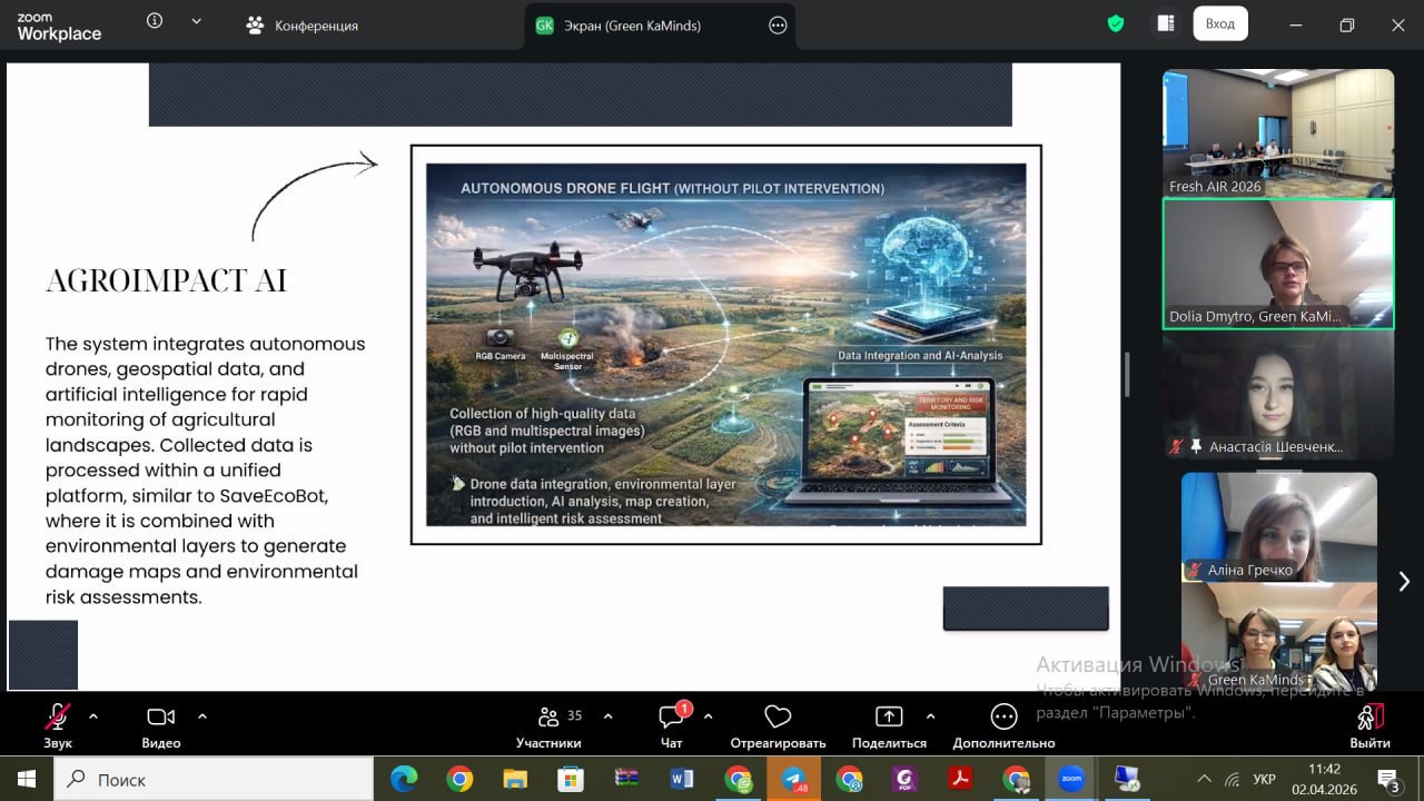 «Green KaMinds» презентували AgroImpact AI — платформу для автоматизованого моніторингу пошкоджених війною сільськогосподарських земель. Їхнє рішення дозволяє за допомогою дронів та ШІ за лічені години аналізувати до 5000 гектарів, виявляючи вирви, хімічне забруднення та створюючи «цифрові паспорти» земель із планами їх відновлення. Час аналізу скорочується на 70–90%, а витрати — до 60% порівняно з традиційними методами.