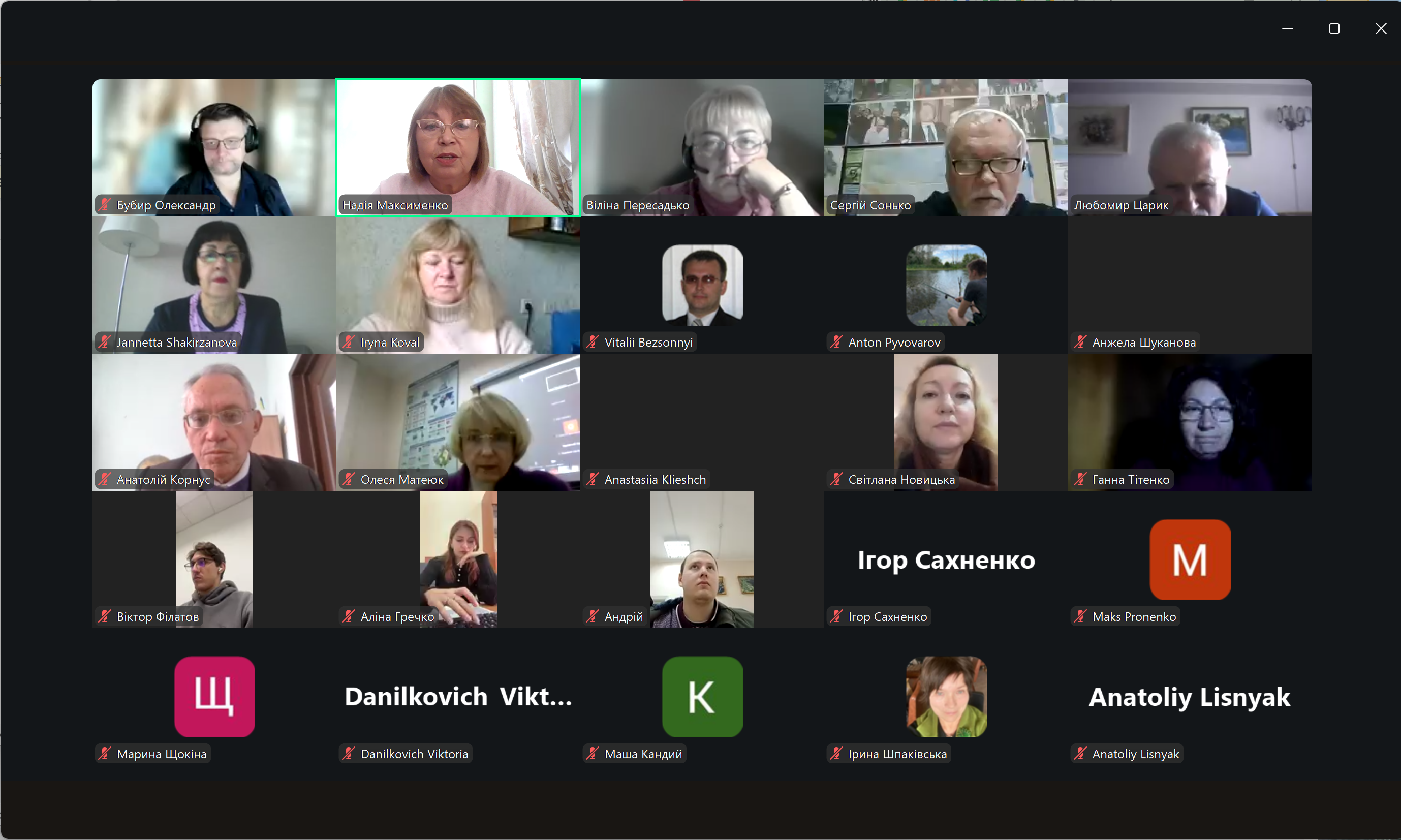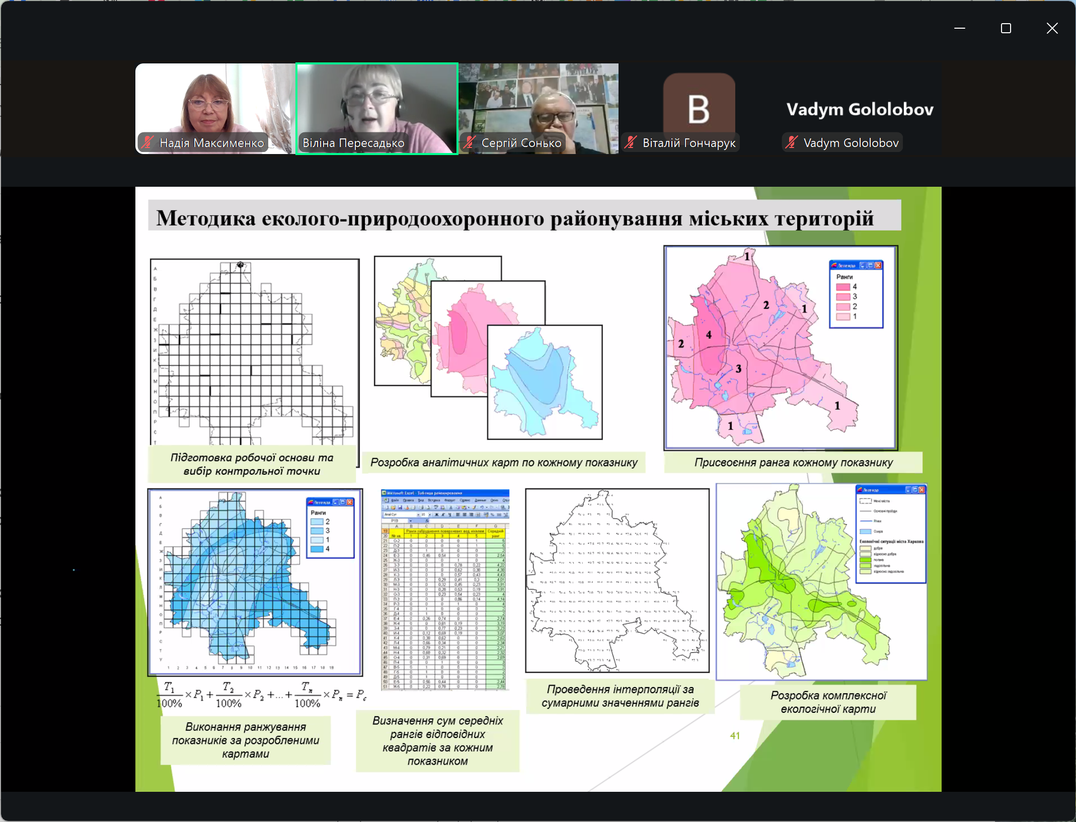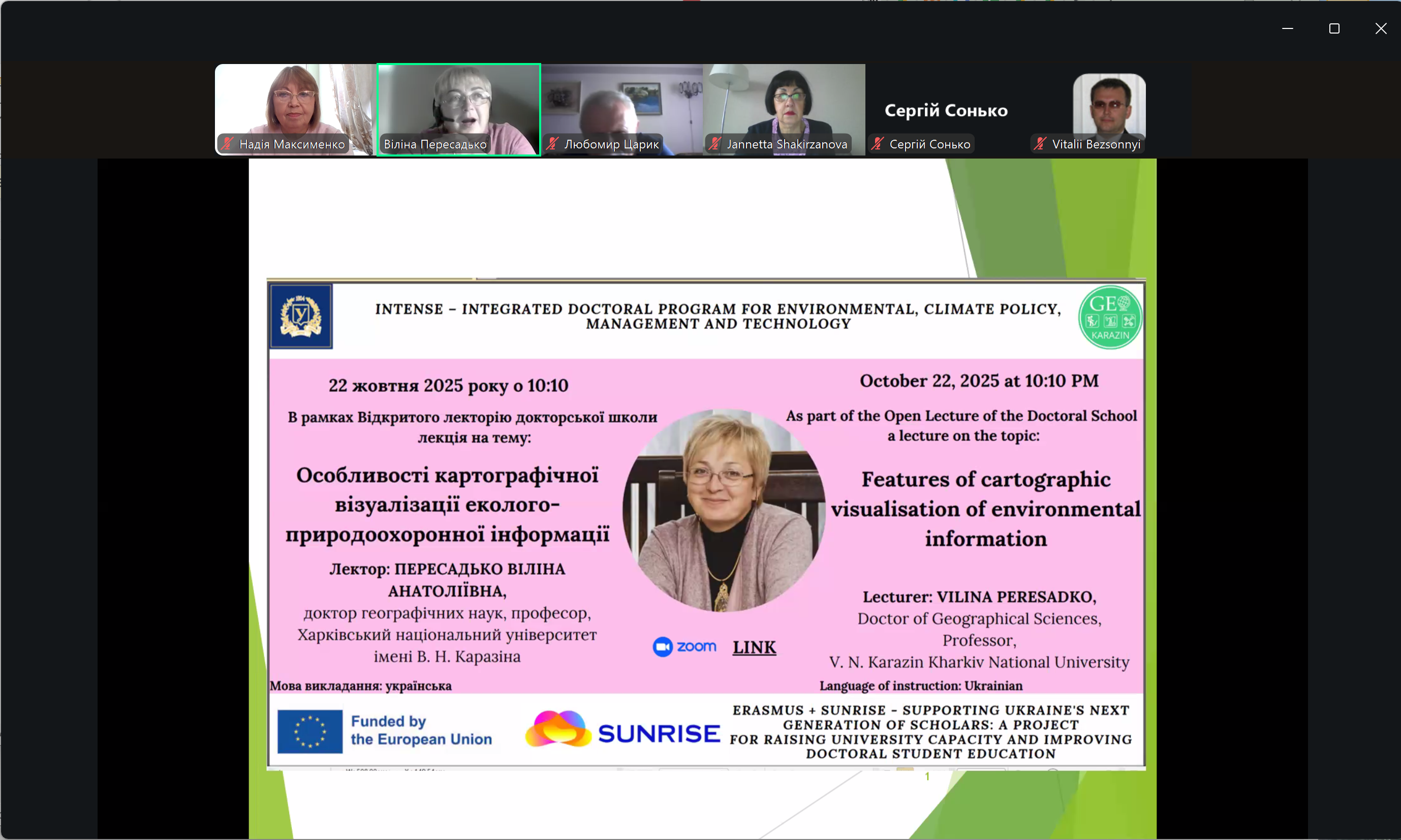 22 жовтня відбулась друга зустріч осіннього циклу лекцій Національної Докторської школи ІНТЕНС за підтримки проєкту ERASMUS + SUNRISE. Лекція від доктора географічних наук, професора Харківського національного університету імені В. Н. Каразіна ПЕРЕСАДЬКО Віліни Анатоліївни на тему “Особливості картографічної візуалізації еколого-природоохоронної інформації” зібрала рекордну кількість відвідувачів – 95! Вони представляли як заклади вищої освіти: Харківський національний університет імені В.Н. Каразіна (Харків), Харківський економічний університет імені Семена Кузнеца (Харків), Уманський національний університет (Умань), Уманський державний педагогічний університет імені Павла Тичини (Умань), Сумський державний педагогічний університет імені А.С. Макаренка (Суми), Київський національний університет імені Тараса Шевченка (Київ), Одеський національний університет ім. І.І. Мечникова (Одеса), Хмельницький національний університет (Хмельницький), Львівський національний університет імені Івана Франка (Львів), Білоцерківський національний аграрний університет (Біла Церква), Кременчуцький національний університет імені Михайла Остроградського (Кременчуг), Полтавський національний педагогічний університет імені В. Г. Короленка (Полтава), а також провідні науково-дослідні установи: Інститут екології Карпат НАН України (Львів), Український науково-дослідний інститут лісового господарства та агролісомеліорації імені Г. М. Висоцького (Харків), Національний науковий центр «Інститут ґрунтознавства та агрохімії імені О.Н. Соколовського» (Харків) , а також представники НПП “Пирятинський”.