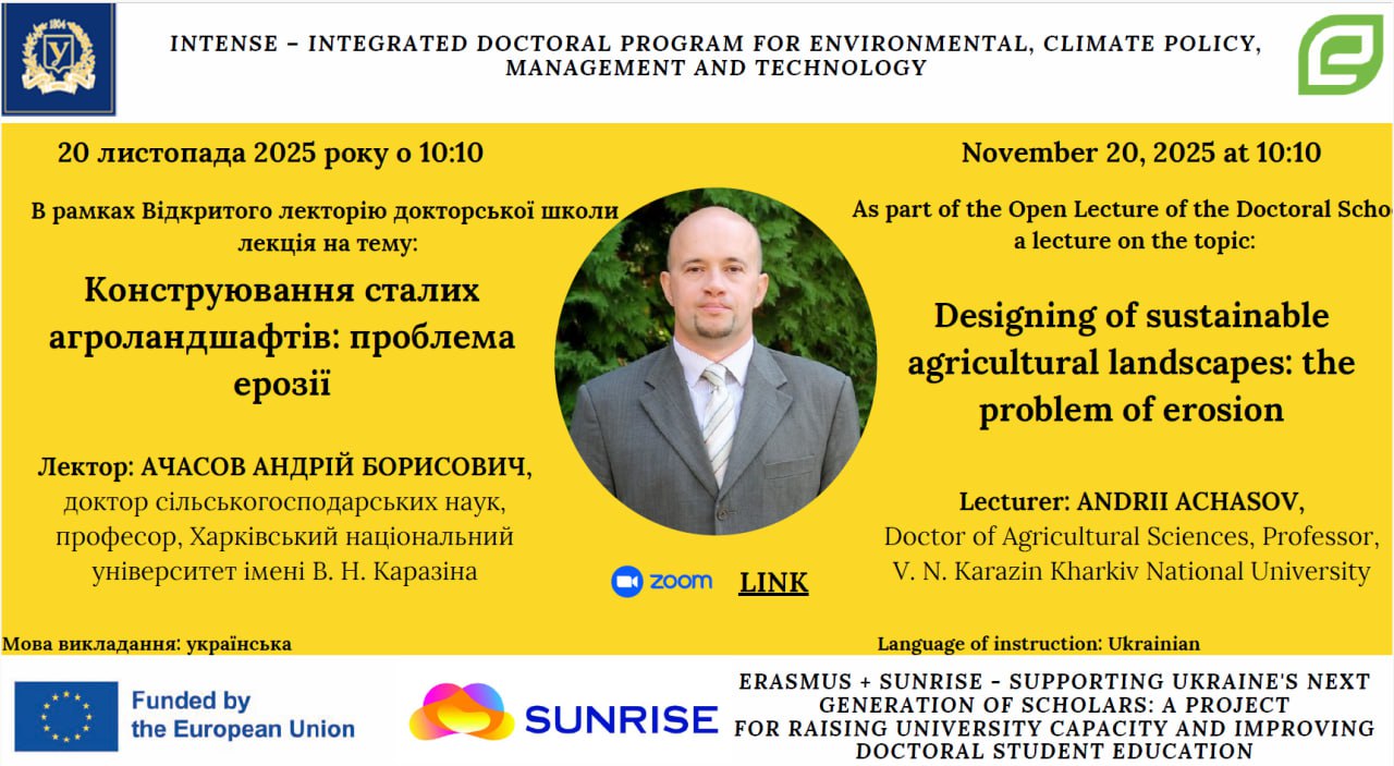 20 листопада 2025 року в рамках  Відкритого лекторію Міжнародної та національної докторської школи з екологічної та кліматичної політики, менеджменту та техноекології INTENSE відбулась фінальна у цьому семестрі лекція на тему «Конструювання сталих агроландшафтів: проблема ерозії», яку прочитав Ачасов Андрій Борисович, доктор сільськогосподарських наук, професор Навчально-наукового інституту екології, зеленої енергетики та сталого розвитку Харківського національного університету імені В.Н. Каразіна.